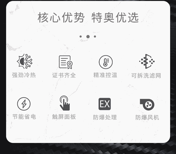 杭州特奥环保科技有限公司防爆空调系列机型通过特殊的技术加工工艺处理,可广泛应用于1区,2区防爆级别,涵盖国防、科研、石油、化工、医药、加工制造、生物制药等多种行业,为存在或可能存在ⅡA、ⅡB级,T1~T4组可燃性气体、蒸汽与空气混合形成的易引发爆炸的危险场所,并有温度控制要求场所设计的特种调温空调设备,改系列产品均通过国家防爆电气产品质量监督检测中心检验,获得国家防爆电气设备防爆合格证,防爆空调外形美观,设计合理并具有安装维修方便等特点,全系列防爆产品内部采用名牌压缩机、微电脑控制、数字显示,具有噪音低、性能稳定、操作简便等优点。深受广大特需行业客户喜爱。