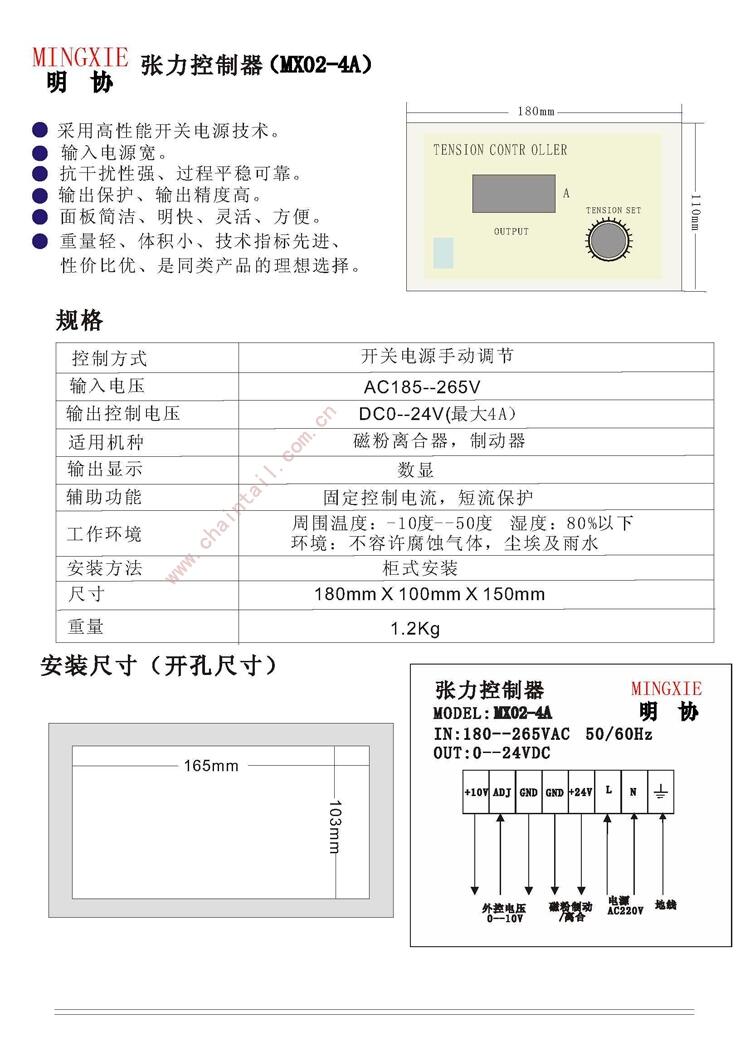 MINGXIE明协牌MX02-4A手动张力控制器采用数显电路,直观、清晰。可外部信号控制(0~10V) 控制方式为脉宽调制切换式调节系统。备有辅助电源输出(DC24V 4A)。