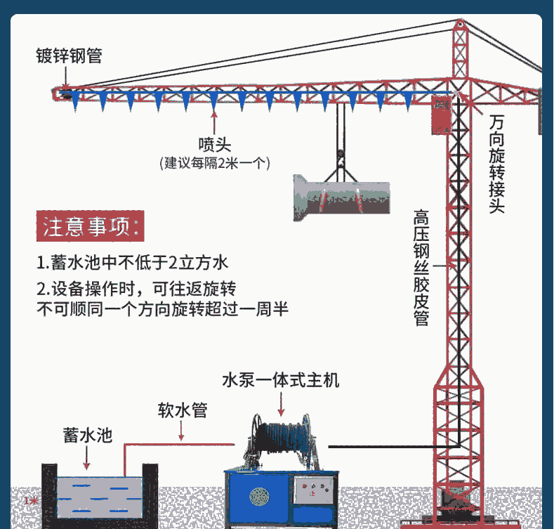中跃机械塔吊喷淋降尘系统包括蓄水池、水泵一体主机、竖向连接在塔吊架上的垂直供水管和横向连接在塔吊横臂上的水平供水管,垂直供水管和水平供水管之间通过万向旋转接头连接,进口端连接蓄水池,通过操作主机的控制器启动水泵后,系统即可开始喷雾工作,塔吊横臂始终在工地的至高点,喷水系统在塔吊的旋转范围内进行、零死角雾状喷水,水通过喷嘴射出飘飞的水雾,可有效吸附空中的灰尘颗粒和杂质,可以控制工地扬尘不往外扩散,起到降尘的作用,同时在高空喷淋一段时间后,地面将形成一片湿润状态,能有效的压制住灰尘重新扬起。