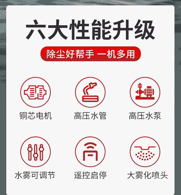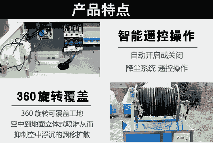 1、喷淋降尘:利用水井或消防水池中的水通过“塔吊喷淋降尘系统”形成飘飞的水雾,吸附空中的灰尘颗粒和杂质,在现场风速低于二级风情况下,可使施工现场大气中颗粒物浓度减少85%,同时在高空喷淋一段时间后,是地面将形成一片湿润状态,有效灰尘的再次扬起。