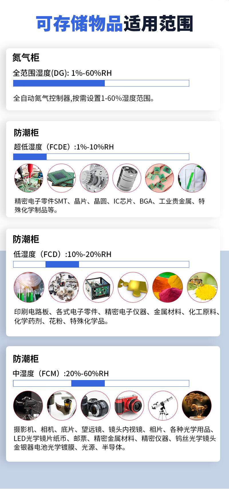 2)10%-20%RH湿度控制范围属于低湿度防潮柜,可存放印刷电路板、各式电子零件、精密电子仪器、金属材料、化工原料、化学药剂、花粉和特殊化学品。