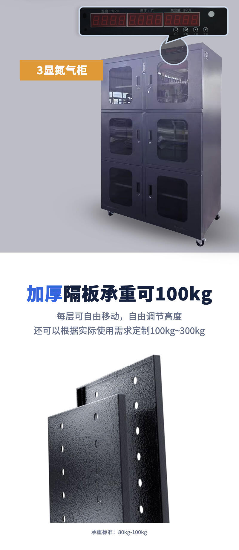 全范围湿度:1%-60%RH,全自动氮气控制,按需设置1-60%湿度范围。采用微电脑自动感应控制,结合氮气瓶或制氮机使用,通过在存储空间中注入干燥的氮气,当湿度超过设定值,自动充入氮气,湿度下降到设定值后,自动停止;LED数码管显示,温度一组,湿度一组,氧含量一组,可调可设置,直观可视,温度显示范围0-99%°C,显示精度±1℃,湿度显示范围0-99%RH,显示精度±3%RH,湿度超标报警。主要用于精密配件、镜头、器件等对湿度极为敏感物品的防氧化存储,有效防止湿气侵入存储空间,防止零部件腐蚀、细菌滋生等问题,环境稳定,保证存储物的长期保存。