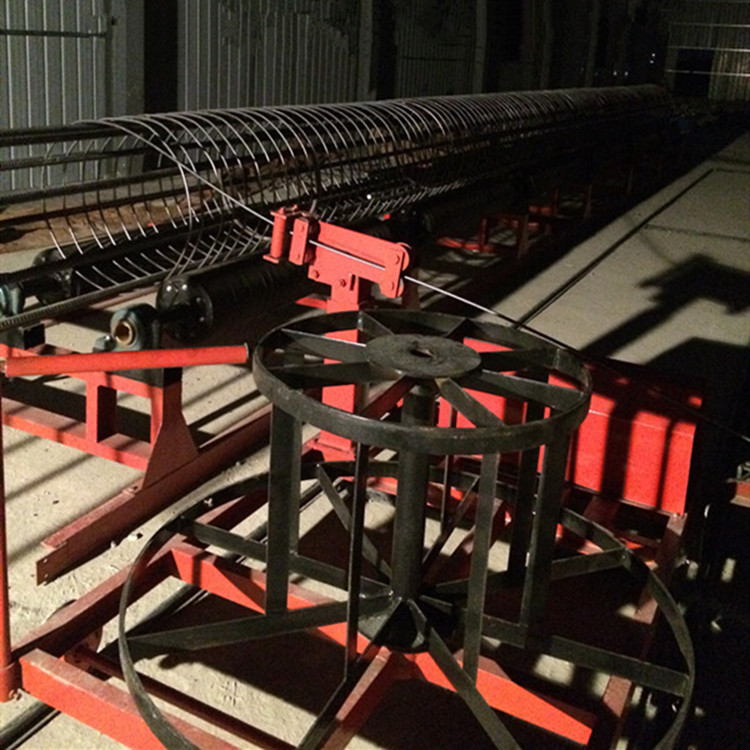 备齐一节钢筋笼所需箍筋按位置平放两胶辊上,将一根主筋抬放于胶辊长度上方,调整好起始尺寸,竖直箍筋,主筋靠着箍筋单面施焊,待主筋转至上方再补焊。焊完一节主、箍筋,低速转动胶辊,抬第二根主筋准备焊接。此时按选定生产工艺确定旋转方向,采用卡具(比子)制作骨架时,待第二根主筋或多根主筋焊完后,主筋下行。若采用挂钩工艺则反向旋转,应注意多根主筋焊好后有可能出现偏重,可将小车部分;车架、圆盘、放线器、轨道、行走轮、电机等组成。