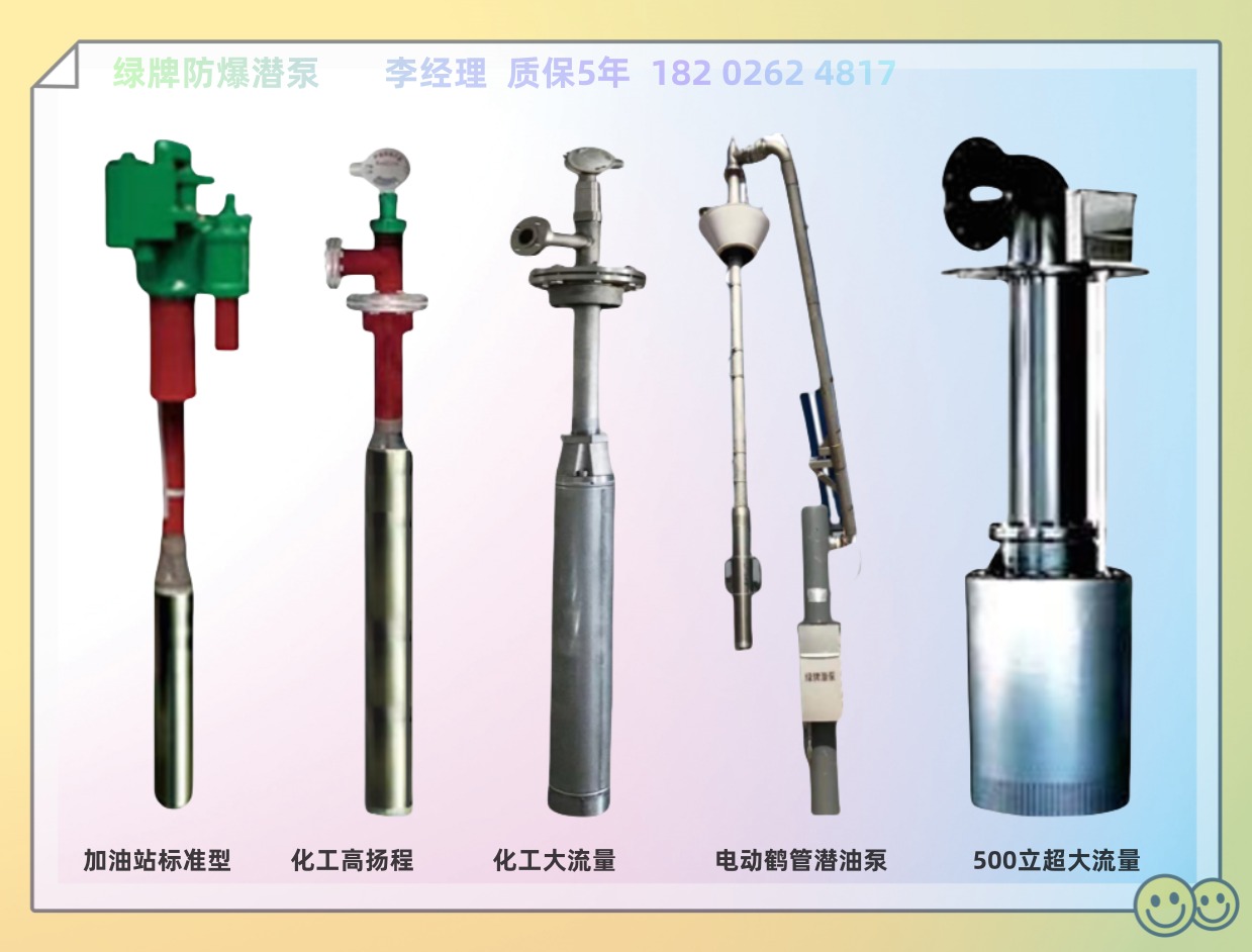 绿牌潜泵可满足50米60米70米扬程,每小时输送50立/70立/90立介质。产品分为八个系列:大流量系列、化工系列、高扬程系列、鹤管系列、标准系列(加油站用)、变频系列、自适应系列、超大流量系列(100-500立方米/每小时)等数百种型号,可以满足用户不同的流量扬程需求。