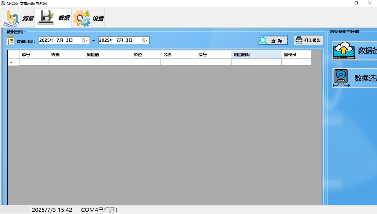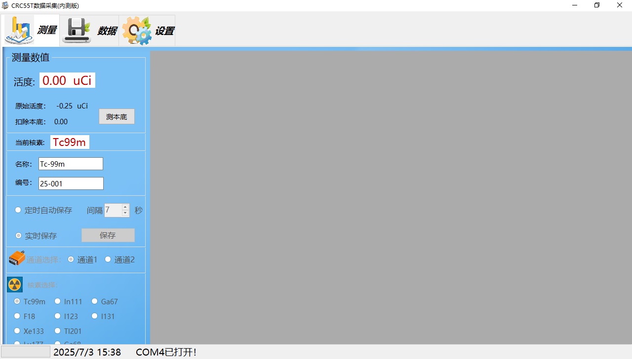 配置台式触摸屏一体机电脑,CRC-55tR、CRC-55tPET活度计主机通过232串口数据线连接活度计软件系统(版本所有:北京华瑞森科技发展有限公司,版本号:V2507.01)。
