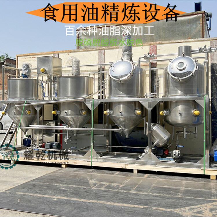 食用油精炼设备 0.5吨标准四罐精炼机组 茶籽核桃胡麻油加工设备经脱磷、脱水、脱酸、脱胶、脱臭、脱色、脱蜡等工序将毛油中对食用和贮藏有害或无益的杂质去除,所得到的成品油被称为精炼油。精炼过的食用油不仅符合我国相关部门的质量标准,而且对人体健康有很大的好处。油脂精炼机组的配套设备包括中和锅、脱色锅、脱臭锅、导热油炉、真空泵、空压机、过滤机、蒸汽发生器等。用于酸练、碱练和水洗、漂白油脂及脱除色素、脱去油脂臭味、提供生产所需热、提供脱色、脱臭所需真空、吹干脱色白土、过滤白土和产生脱臭蒸馏所需蒸汽。