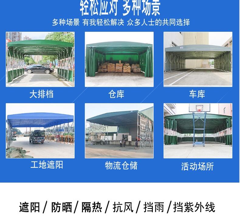 汽车户外遮阳棚 本身的一个非常大的优点就是移动便利、可推拉,毕竟在很多场合下我们对于推拉伸缩雨棚的需求都是短暂性的,比如突然下雨的时候,露天大排档有食客,或者厂家的产品无处安放的时候。可是,一旦这个需求时间过去的话,一个推拉伸缩雨棚可以会变成累赘,造成各种不方便,如占用空间,影响光线等。所以,可移动的推拉伸缩雨棚大的优点就是在有需求的时候出现,在不需要的时候收缩起来,十分人性化,便利实用。