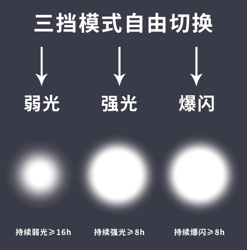 电量检测:特设电量提示功能,当电池电量不足时,灯具会闪烁5次,强光自动切换到工作光状态,延长照明时间并提醒用户及时充电;