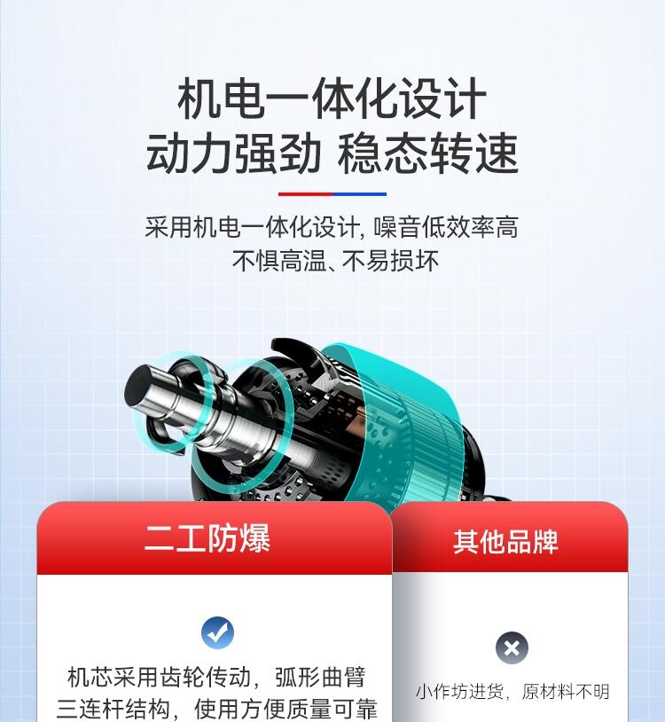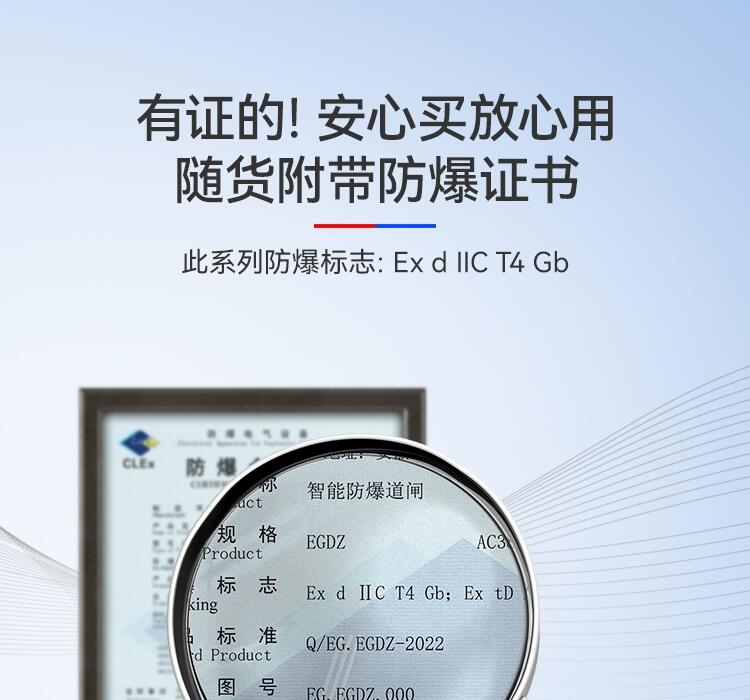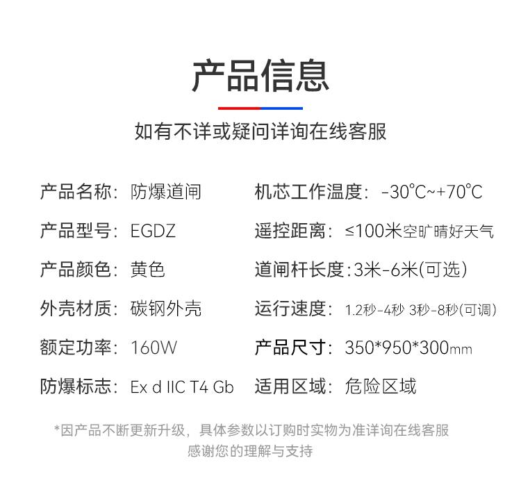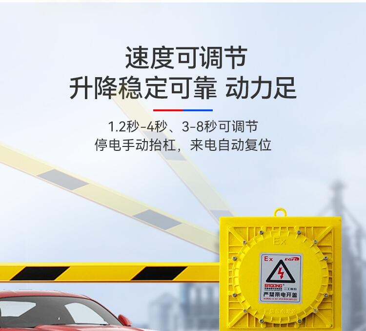 二工智能防爆道闸内部采用160w大电机,快速启动闸杆,3-6秒可调速,本产品是一种典型的机电一体化产品,其以体积小、防爆性能好、噪音低、效率高、调速广、稳态转速误差小等特点。四代减速箱,道闸专用,多速比可选择,运行平稳,定制齿轮传动效率更高,稳定性高,采用最新模具设计技术,优质钢材折弯焊接成形,无刷控制调速技术,左右可快捷互换,无离合设计,质量更加可靠,使用更加方便,机芯采用齿轮传动速度快、弧形曲臂三连杆结构,起落杆快速平稳。维护方便、使用寿命长。