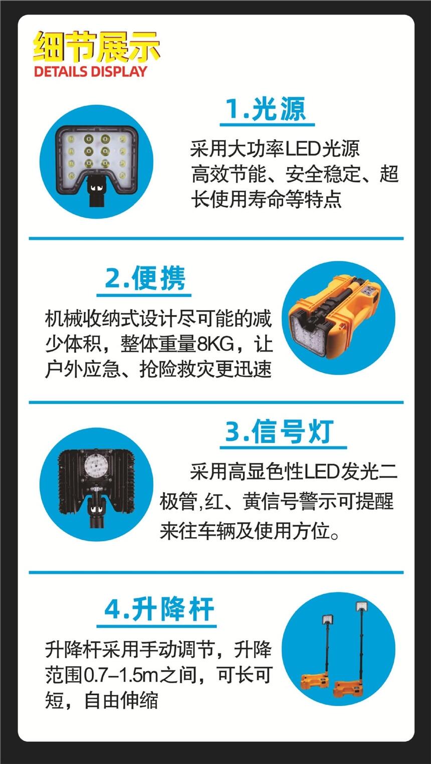 ◆轻便耐用:灯具体积小、重量轻,可以实现手提、背行两种携带方式。灯具也可以安装铁轨轮,方便用户在铁路单轨上移动;