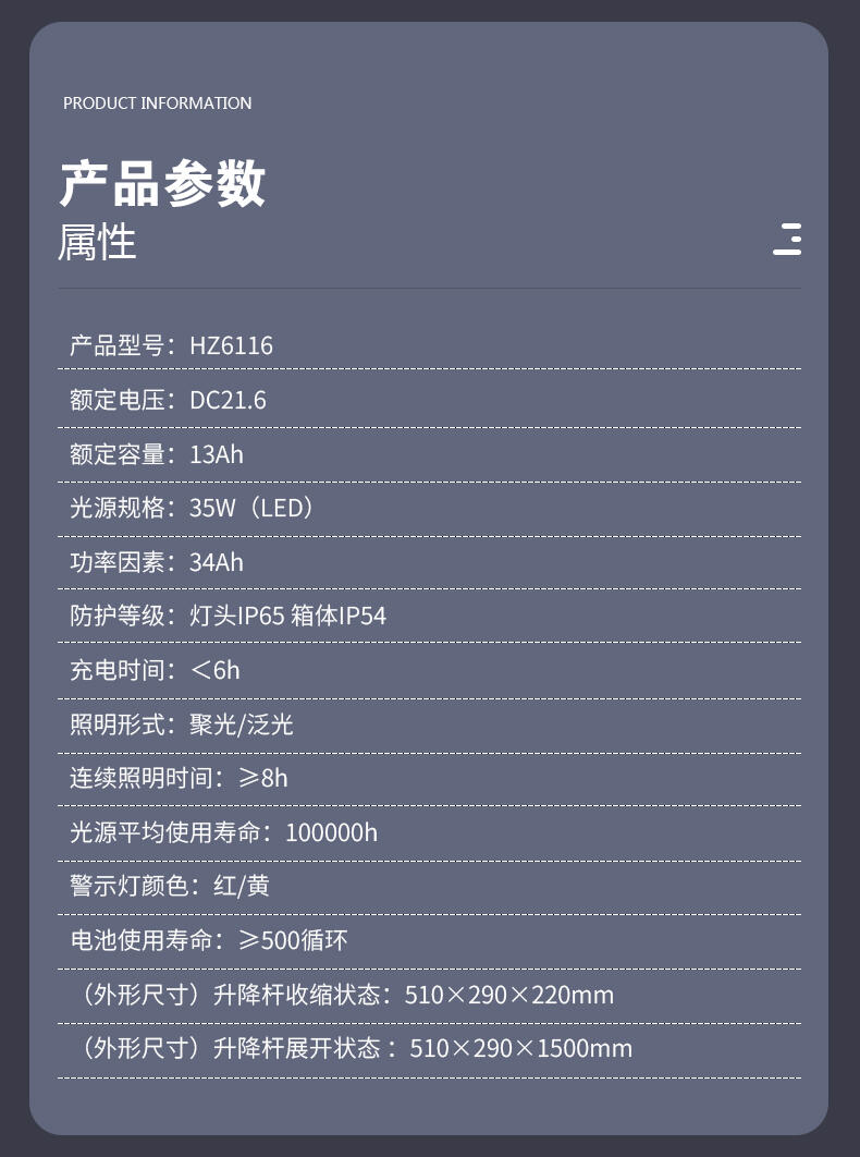 ◆充电方便:可通过灯具配备的锂电池充电器(输入AC220V,输出DC21.6V/2.8A)灯具进行充电,可满足长时间照明需求。