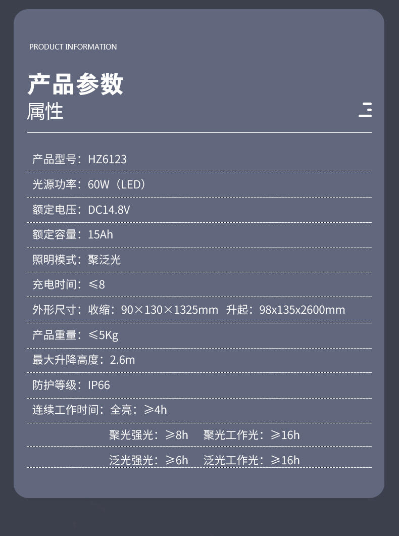 ◆升降性能:灯杆采用2节可升缩折叠三脚架来实现灯头照明高度的调节,最大升起高度为2.6米;