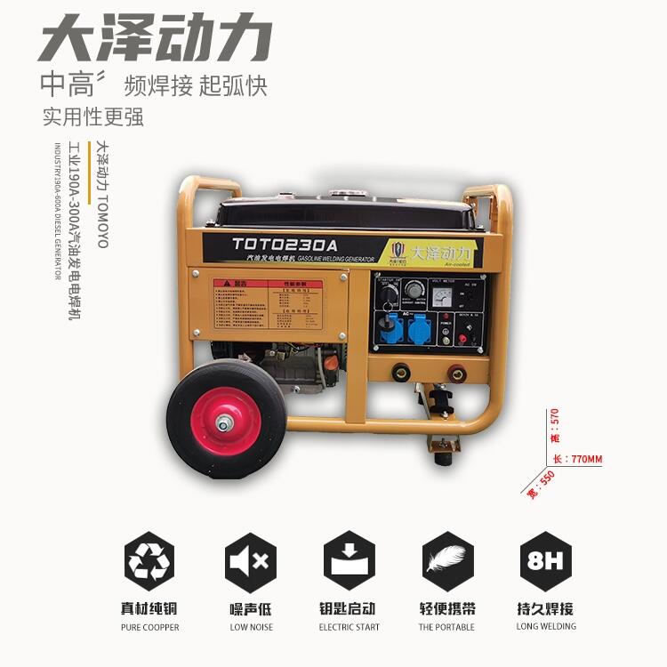 焊接采用50/60Hz 整流,再经滤波输出,其纹波较大,不利于提高焊接产品的质量。大泽发电电焊机做工精美.;由于焊接绕组输出功率的限制,其焊接的负载持续率较低,限制了连续工作能力。四冲程风冷发动机,油耗低,可靠性强,大容量油箱,有效保持12小长时连续工作,重量轻,体积小,配有移动轮,为施工提供极大的便利汽油发电电焊机以汽油机为动力旋转发电,通过整流模块提供电焊用直流电。又叫发电电焊两用机,可以作为发电机用,同时也可以作为.个电焊机用。