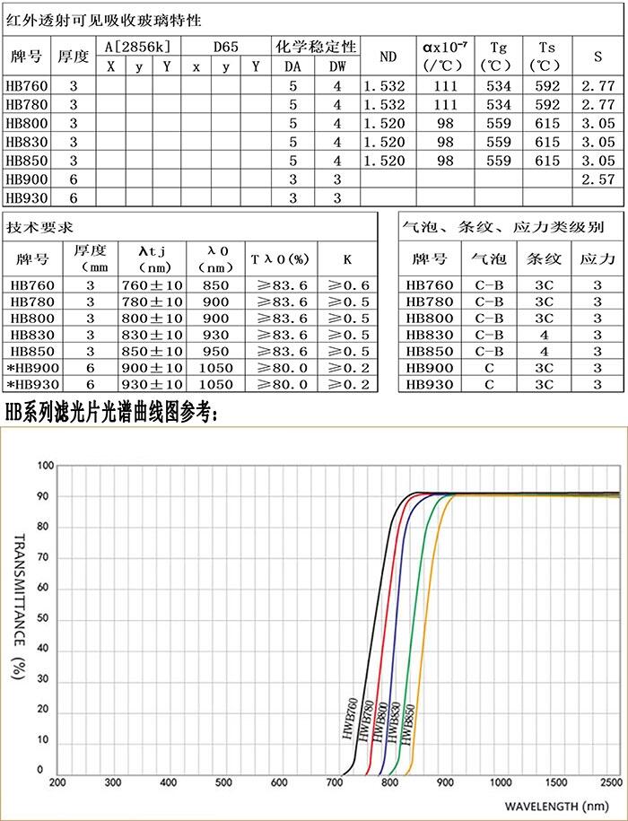 红外光学玻璃,红外透射可见吸收光学滤光片HB800透过的波段800-2500纳米,红外光学玻璃HB800波长的范围200-2500纳米。800nm滤光片(红外玻璃)材质选用的是有色光学玻璃,HB800牌号的有色玻璃适用于各种光学设备等应用领域。