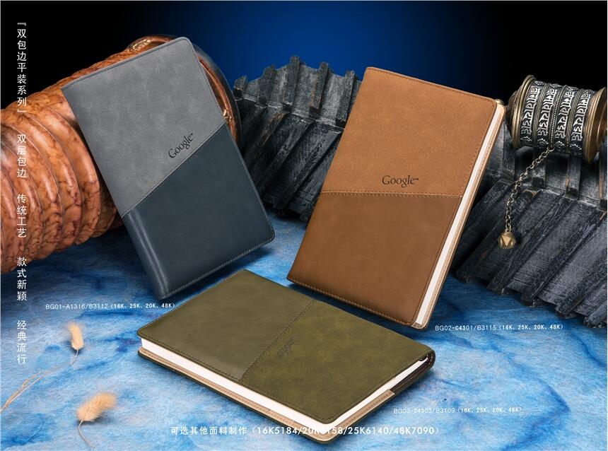 封面材质:仿皮、PU、变色PU、植绒 皮料颜色:可根据客户自选 封套工艺:可以做油边、缝线、有搭扣、无搭扣、拼接等根据客户要求制作 LOGO工艺:压印、烫金、烫银、烫蓝金等根据客户要求选择 内页用纸:80克94张米黄道林纸