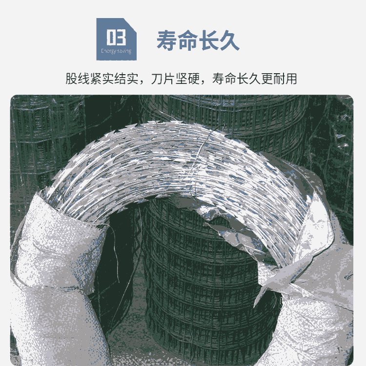 一种新型防护网,由锐利尖角镀锌钢板或不锈钢薄板做刀片,钢丝做芯线组合而成的防护器材该产品具有吓阻、防翻越等效果,材质坚硬,高强度,高张力,造型设计 ,不宜触摸,因而能达到 的防护隔离效果。还具有施工简便,经济实用等优点。