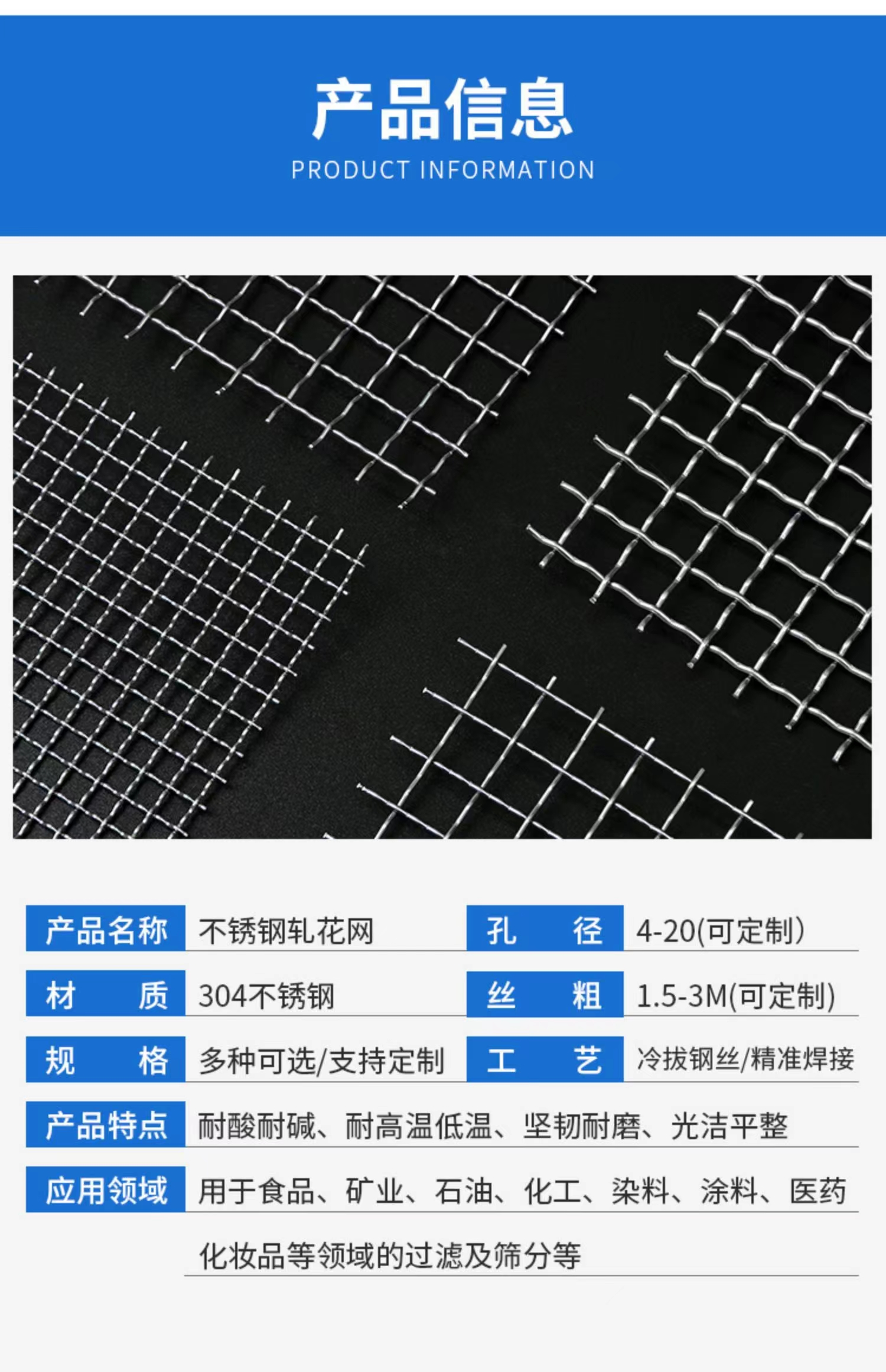 用途 | 泛用于矿业、石油、化工、污水处理、建筑、机械附件、防护用网、烧烤网、烧烤炉用网、工艺品用网、震动筛网、网篮用网、食品机械用网、炊具用网、墙体网、粮食,可作固体材料的分级筛选、液体和泥浆的过滤、养殖、民用等。 | ||
