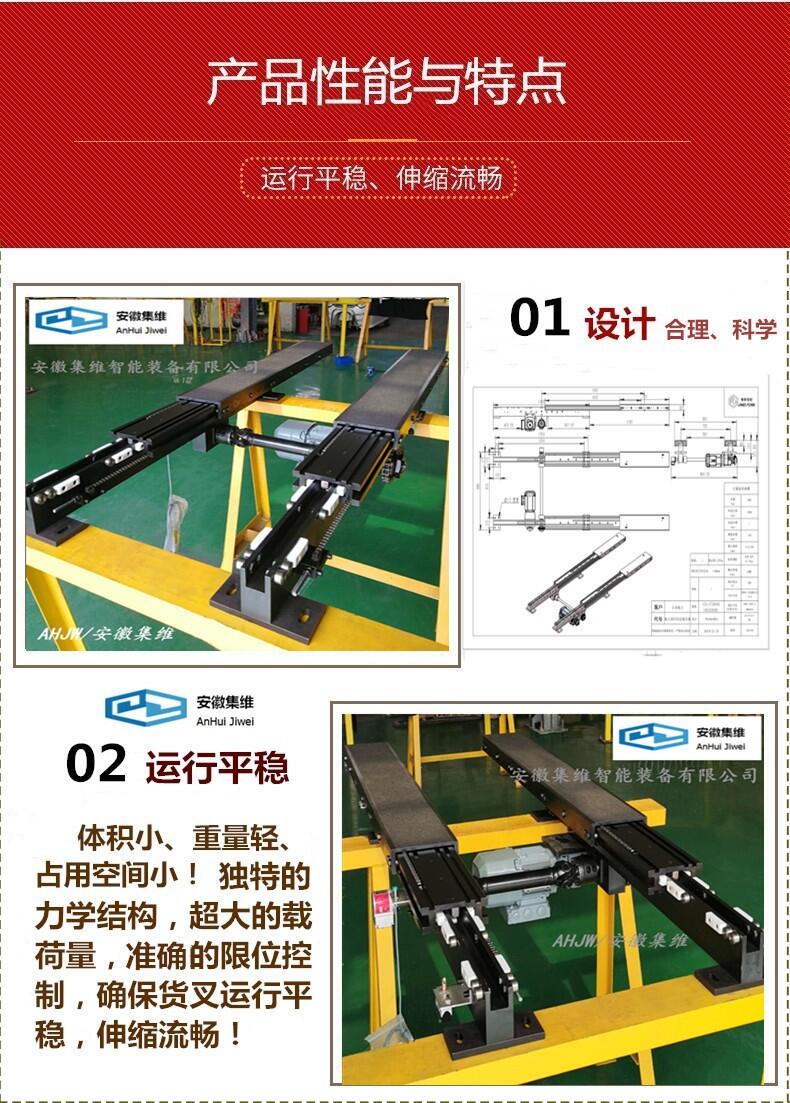 公司自主研发生产的AHJW系列堆垛机三级伸缩货叉,经过大量工程案例的检测和数据验证,具有载荷大、挠度低、限位准确、重复定位精度高、运行平稳、伸缩流畅等特点!