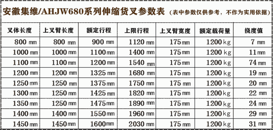 为方便用户对货叉的了解和选型,我们罗列了60种常用的规格(或型号),归类为5个系列,如:AHJW68系列、AHJW180系列、AHJW200系列、AHJW250系列、AHJW275系列等,这5个系列产品中的数据是行业内使用比较多、涉及比较频繁的几个参数,我们在选型时可作为参考,但不能以此作为实用依据!