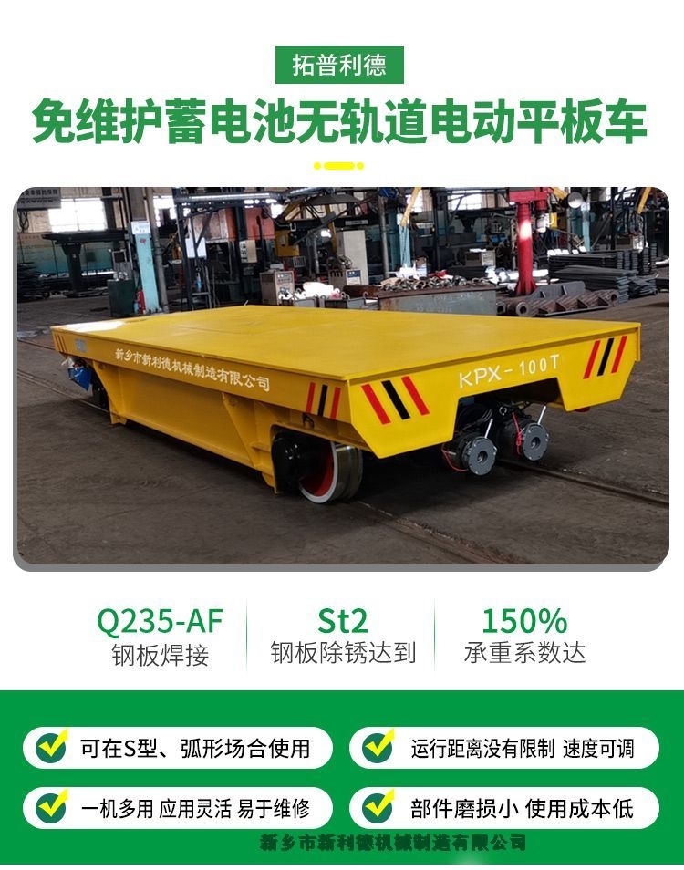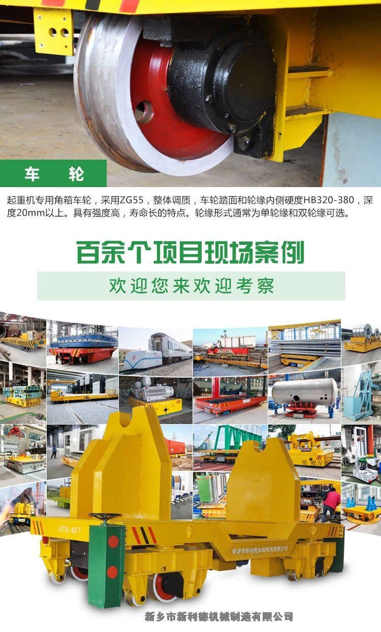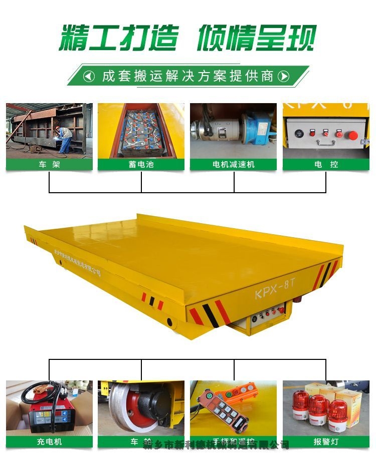 KPX蓄电池电动平车以蓄电池供电产生动力,蓄电池安装在电动平车的内部,蓄电池给直流牵引电机提供电力,通过遥控器发出启动、停止、前进、后退、调速等命令,电气控制系统下达命令至直流电机拖动电动平车运行。