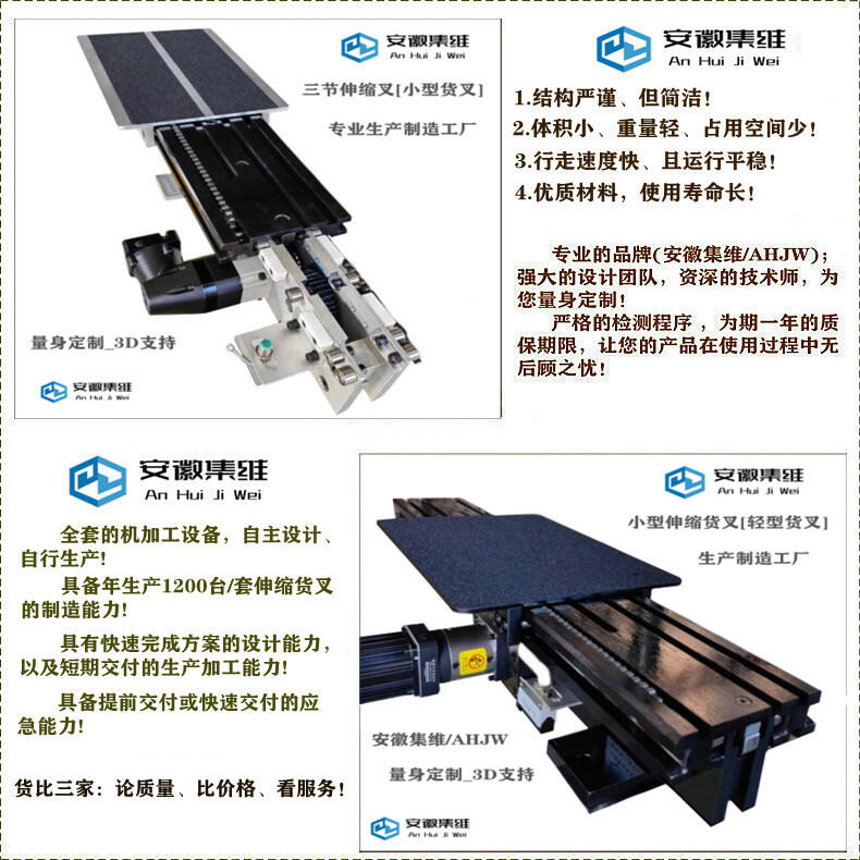 安徽集维智能装备有限公司[马鞍山市]是一家集研发、生产、销售为一体的堆垛机伸缩货叉生产制造厂家,拥有多位资历深厚的工程设计师和技术人员,全套的机加工设备,完全自主设计、自主生产,具备年生产1200台套伸缩货叉的制造能力,具有完成方案的设计能力,以及短期交付的生产加工能力,具备提前交付或快速交付的应急能力!