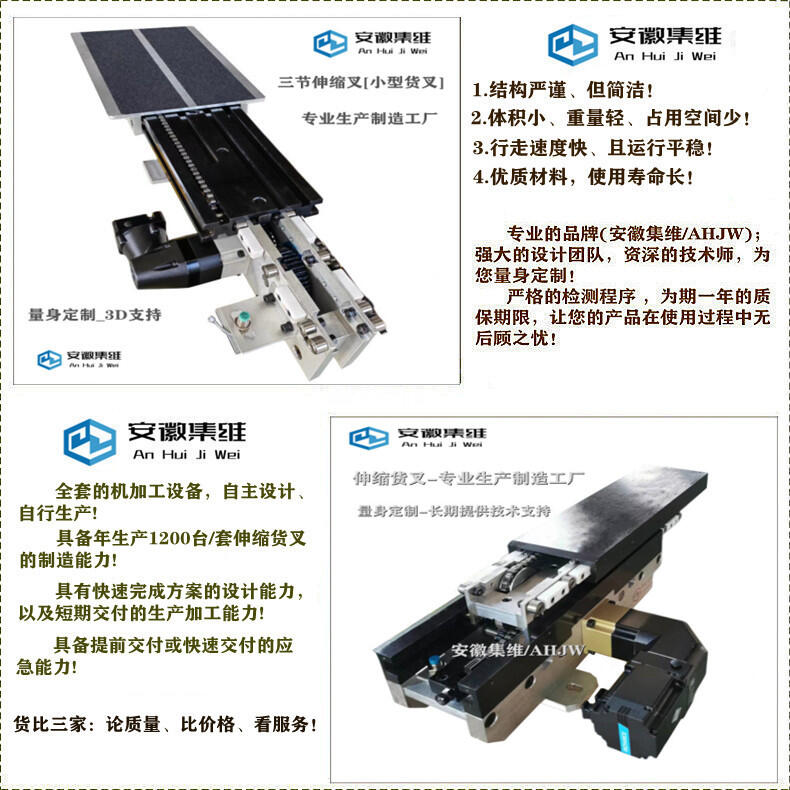 安徽集维智能装备有限公司[马鞍山市]是一家集研发、生产、销售为一体的伸缩货叉生产制造厂家,拥有多位资历深厚的工程设计师和技术团队,全套的机加工设备,自主设计、自行生产,具备年生产1200台套伸缩货叉的制造能力,具有快速完成方案的设计能力,以及短期交付的生产加工能力,具备提前交付或快速交付的应急能力,为您量身定制各类伸缩货叉!