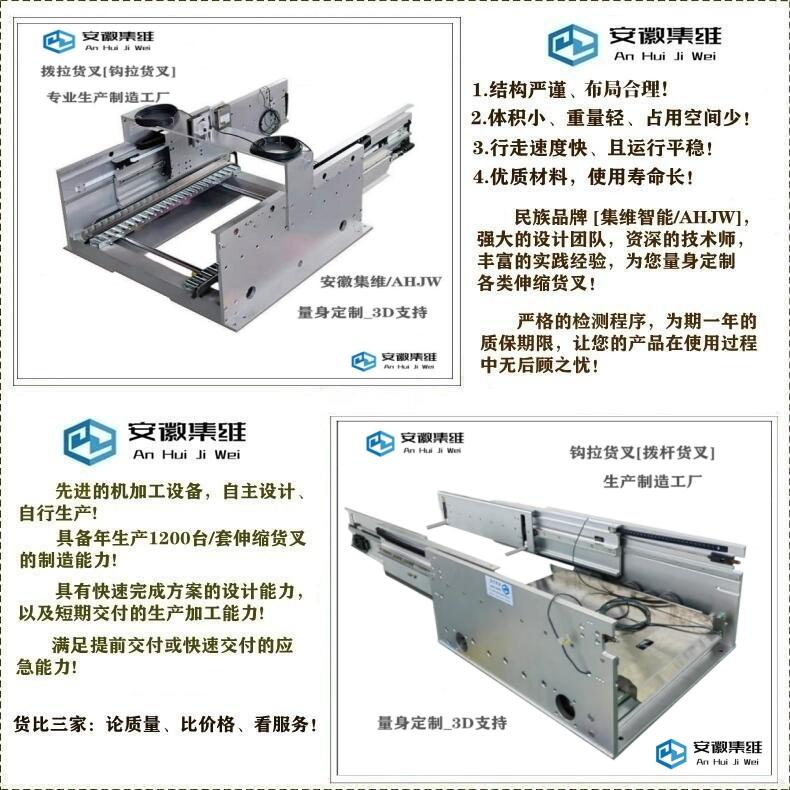 友情提示:钩拉式货叉虽然体积比较小、重量也比较轻,但结构却比较复杂,因此加工周期相对而言要长一点,想了解具体细节,请直接联系生产供应商[安徽集维智能装备有限公司],我们会在短时间内给您准确回复!
