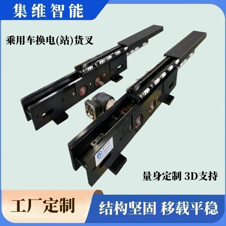 新能源乘用车换电站电池进出输送移载货叉简称:乘用车换电货叉、换电站货叉、换电站移载货叉、电池进出输送货叉等,它分单列式和双列式两种类型,单列式指的是单根叉臂独立完成换电任务,而单列式指的是两组叉臂通过联轴器进行组合传动和联合运行完成电池包移载任务!