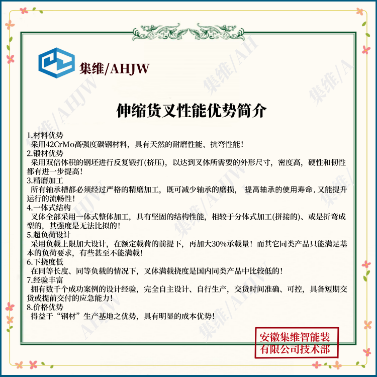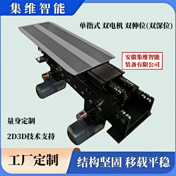安徽集维智能装备有限公司(马鞍山市)是一家专(zhuan)业的伸缩货叉(移载货叉)生产制造厂家,拥有完整的质量管理体系、丰富的设计经验,雄厚的加工实力,完(wan)全(quan)自主设计、自行生产,拥有十多项实用新型专(zhuan)利证书,具备年生产1600多台套各类伸缩货叉(移载货叉)的制造能力,具有快速完成方案的设计能力,短期交付的生产加工能力,具备提前交付或快速交付的应急能力,是业内较具规模的实体工厂!