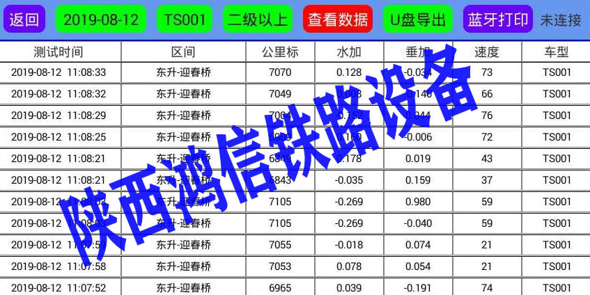 西户陕西鸿信铁路设备提供铁路机车车辆全自动添乘仪是车体晃动检测设备,检测结果反映出列车的舒适度间接的反映铁路区间道线路动态质量。监测线路状况的铁路仪器。设备由添乘仪主机、添乘仪传感器模块及便携小型打印机组成。添乘仪传感器采集的数据和GPS信号经过处理器分析处理,显示出电压、时间、车型(需手动输入)、公里标、水加、垂加、运行区间等,并进行存储,是对铁路区间钢轨参数进行间接反映的仪器,具有U盘导出和蓝牙打印功能、技术指标:1、检测范围:0.01-0.50g2、检测误差:<0.01g3、非线性:<2%4、检测频带:0.2-10Hz5、采样频率:200Hz6、里程测定范围:0-9999.9Km 7、车速测定范围:0-350Km/h 8、里程定位误差≤20m 9、车型设置:大于50种10、电池:可充电11、连续工作时间>20小时12、通讯接口:USB13、自带打印机14、工作环境温度:-10℃-+50℃15、外形尺寸:200mmX145mmX65mm16、重量:<1kg。