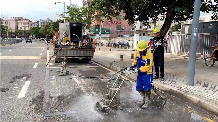 一阵水雾过后仅仅两分钟旧标志线便得干干净净其主要施工机械为高压水射流标线清洗机。这种水射流具有极强的冲击力和切削力,可直接深入到沥青孔隙中对标线漆进行。除线机冲击力太大就会损伤构筑物低层结构,会使工程留下隐患。此外,在大型水泥混凝土工程铺装层间进行凿毛时慎用大型铣刨机或抛丸机进行凿毛处理。因铣刨机的铣刨刀头与其铣刨转子为刚性连接,铣刨转子又非常沉重,其刀头密度又比较少,所以在铣刨切屑时,接触工作面的点数少,其转子的冲击力就非常大,铣刨机铣掉的不仅是浮浆和部分骨料。