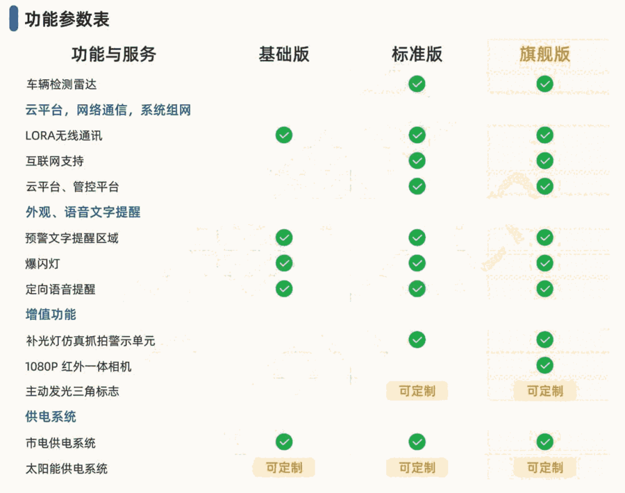 致力于为客户提供完整的交通安全产品和解决方案。包括:行人过街安全预警,弯道预警,雨雾诱导预警,智慧斑马线,智能违法抓拍,高速公路行车安全防疲劳驾驶,隧道行车安全信息诱导,智慧城市等系统产品,以及交通综合管理平台和智慧运维手机APP、小程序。品牌理念