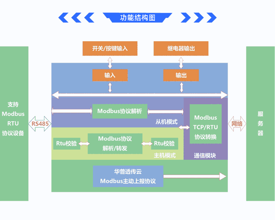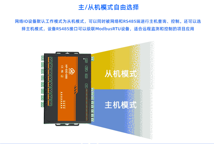 支持8路继电器输出、8路输入,支持50CKET连接远程服务器;支持WEB网页设置设备参数,支持主动上报功能,支持两种工作模式:主机模式、从机模式,主机模式支持RS485级联多个MODBUSRTU 设备,支持MODBUSTCP/RTU协议自适应,支持连接华普华普云支持8个条件控制指令控制更加便捷,支持硬件看门狗。