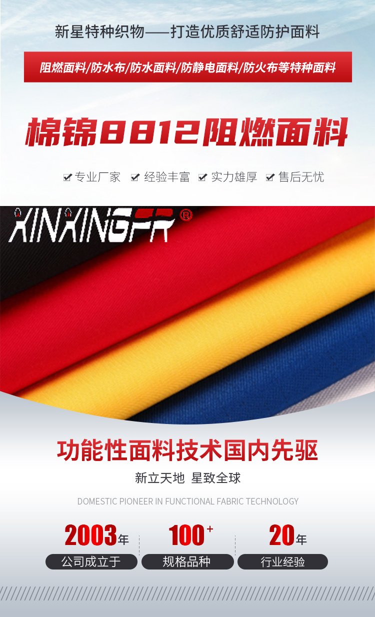 棉锦88/12阻燃面料 三防布防静电 针织斜纹直贡帆布等 品牌 | 新星 | ||