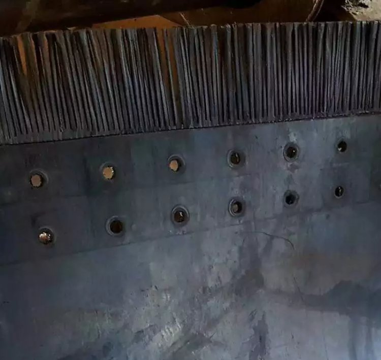 大倾角挡边输送带由基带、挡边、横隔板3部分经硫化工艺制成。挡边起防止物料测滑撒落的作用,为便于绕过滚筒,挡边设计成波纹状;横隔板的作用是承托物料,为了实现大倾角输送,采用T型TC型。档边和横隔板是用二次硫化的方法与基带连接的,具有很高的连接强度。