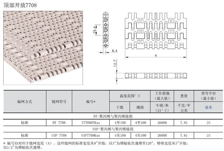 7700系列1英寸节距重载型链网被广泛用于各种场合。由于其结实的设计造型,这些链网被推荐用于玻璃制造和汽车工业。7700系列型号多样,包括一款封闭型、两款开放型、一款带橡胶垫和一款LBP型。对于单行输送,提供带勾脚型引导一次注塑成型的定宽型号。对于玻璃制造和饮料工业,推荐使用经实践验证可行的动态果度传送系统。这些标准链网均为高性能乙缩醛和聚丙烯材质。