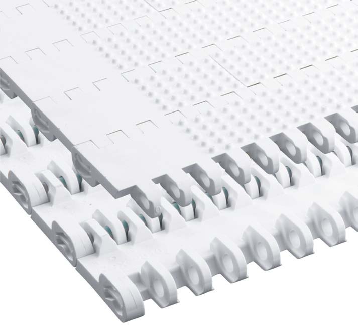 这些模块表面都是非常平顺的,没有封闭的或隐藏的凹坑。链网下方各排铰孔之间的开放区为链网的清洁带来极大的方便。链杆固定去非常容易进行清洁,由于无齿环或隐藏区,因此不会存积污垢和碎片。