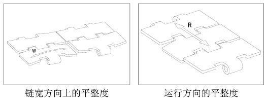 在整个生产过程中,分别在运行方向(R)和链宽方向(W)测定平整度。当产品从一个链条向另一个链条侧向滑动式,链宽方向上的平整度显得非常重要。因此,所有莱克斯诺和MCC链条的横截面是凸形的,而非凹形的,起目的在于防止产品倒瓶。由于生产过程中的精心控制,这些链条具有出色的横向平整度值,该数值可以在每个链条对应页码中的表格上找到。