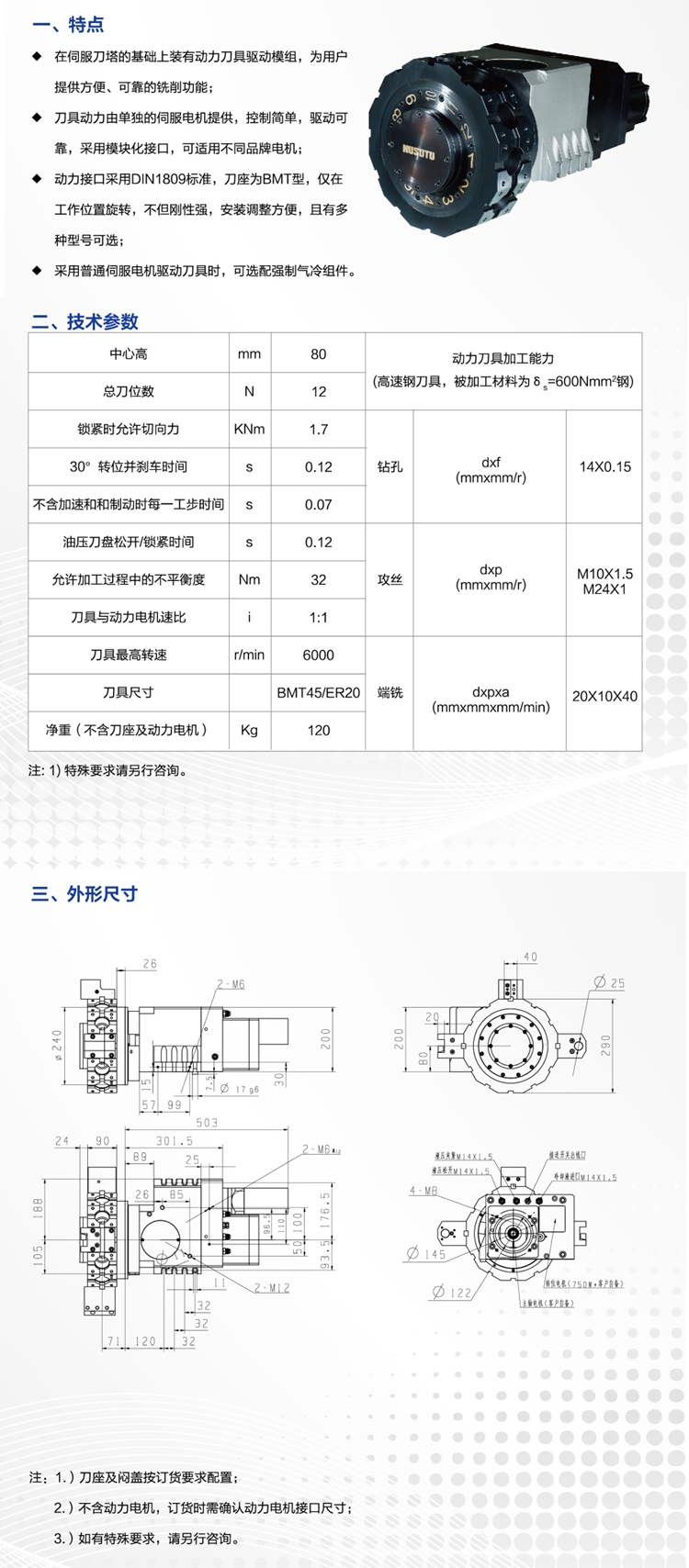 动力接口采用DIN1809标准,刀座为BMT型,仅在工作位置旋转,刚性强,安装调试方便,且有多做型号可选;