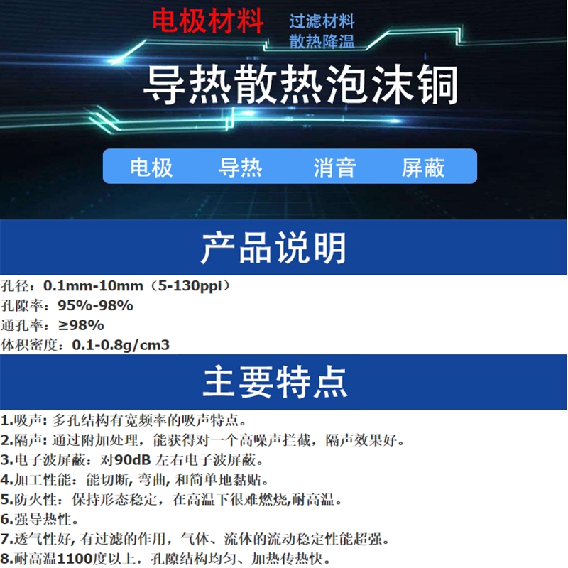 1)泡沫铜具有优良的导热性能,可广泛用于电机/电器及电子元器件的导热散热