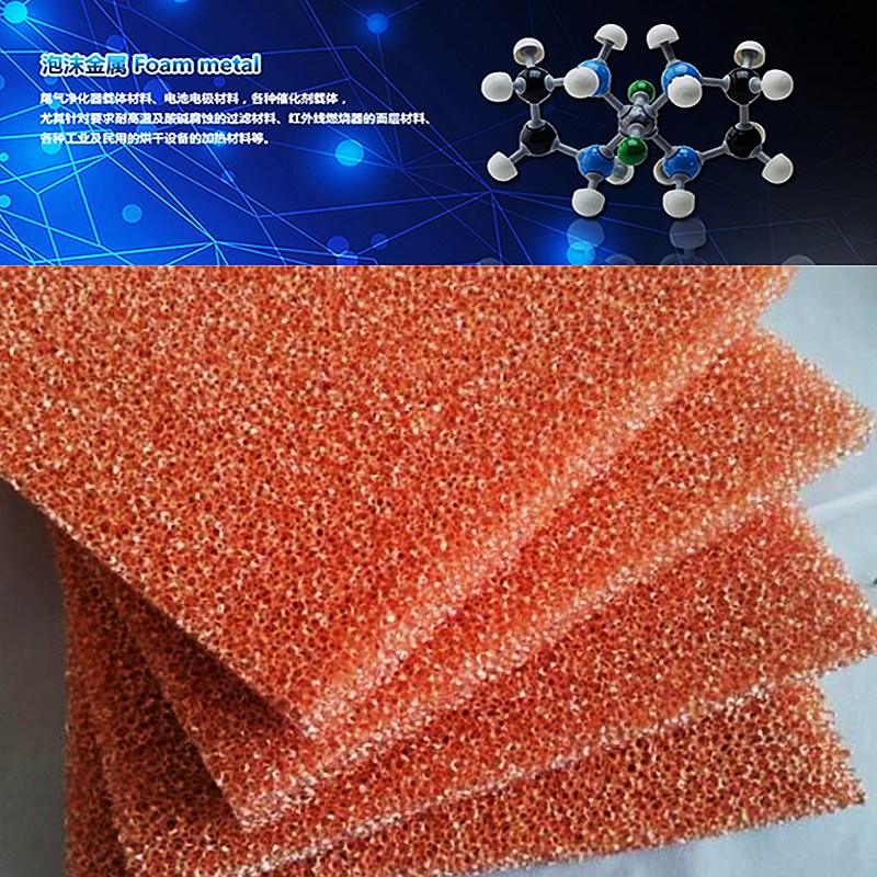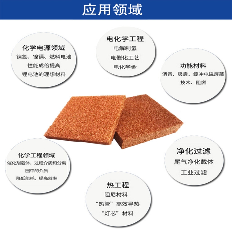 (2)催化剂。在许多有机化学反应中,人们尝试直接利用具有大比表面积的泡沫铜替代冲孔铜板,作为化学反应催化剂;泡沫铜作为光催化空气净化载体,