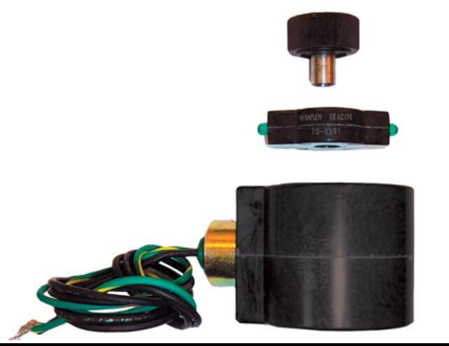 All Hansen solenoid valves utilize a one-size encapsulated, watertight coil. These coils are strong and efficient, requiring only 16 watts of power. All common voltages and frequencies are available. Coils are designed to operate from 85% to 110% of rated voltage. Pilot light assemblies are also available. The pilot light assemblies require no additional wiring.