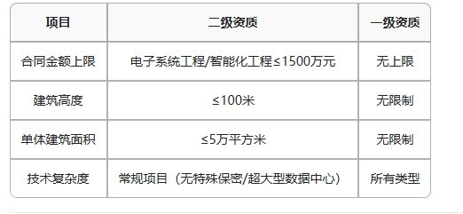 智能化二级资质(即电子与智能化工程专业承包二级资质)的工程承接范围主要受合同金额、工程类型、规模及技术复杂度限制,具体如下:
