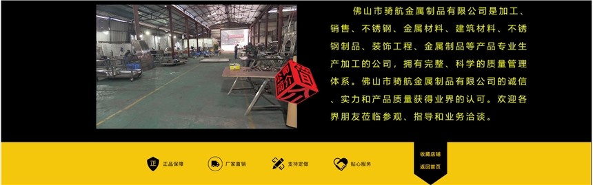 本公司是一家以主营加工,销售不锈钢制品,金属材料,承包装饰工程优秀企业。佛山市骑航金属制品有限公司,坐落于不锈钢生产销售基地——广东省佛山市顺德区陈村镇潭村工业区——力源金属物流城。公司拥有2000多方生产厂房,旗下有激光切割厂、剪压钣金厂、金属制品厂、电镀加工厂、抛光拉丝厂等团队鼎力支柱,设备齐全、工艺精湛、实力雄厚!公司专业生产不锈钢制品,集业务-生产-销售为一体的不锈钢综合型企业。 公司配有专业的施工团队,可承接酒店装饰工程、KTV装饰工程、售楼部、园林园艺不锈钢工程……