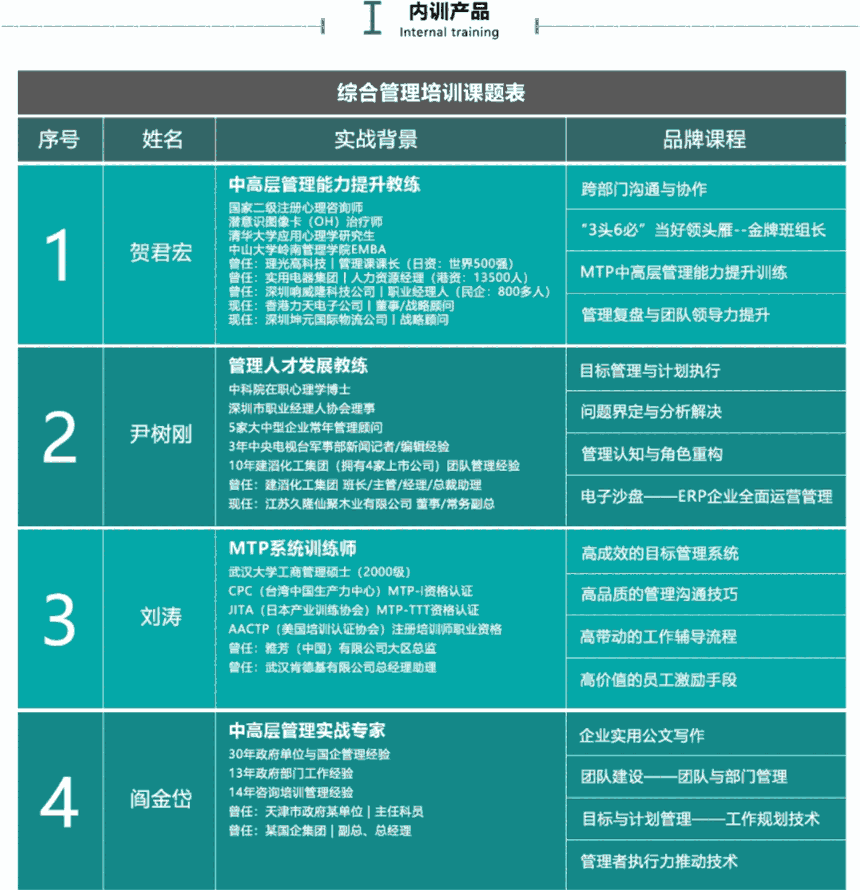 满足企业管理、经营需求,内训课程涵盖各行业、个领域、各管理职能全系列课程,下表只是部份展示,具体可以联系客服:15223337163,索取专业课程计划大纲;课程满足企业定制课程需要,针对性强、互动性高、面对面教授;