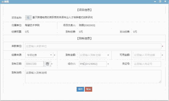 管理人员在收到到帐信息后可为项目登记到帐经费,可设置项目经费可用额度。