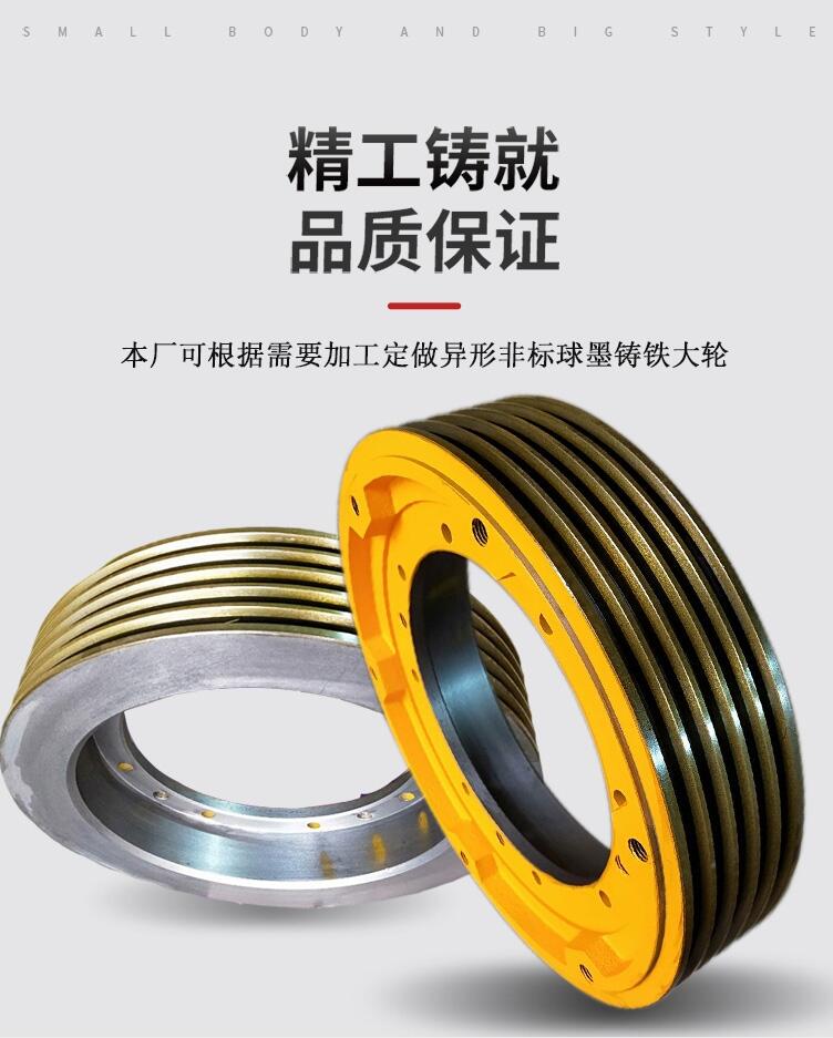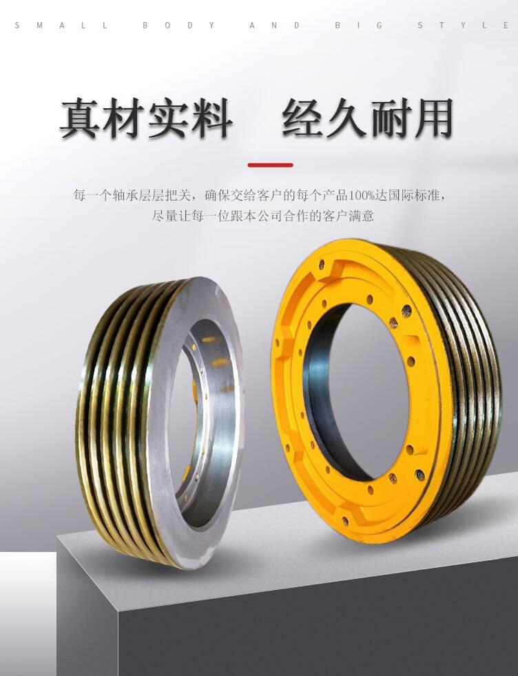 由于曳引轮要承受轿厢、载重量、对重等装置的全部动、静载荷,因此要求曳引轮强度大、韧性好、耐磨损、耐冲击,所以在材料上多用球墨铸铁。为了减少曳引钢丝绳在曳引轮绳槽内的磨损,除了选择合适的绳槽槽型外,对绳槽工作表面的粗糙度、硬度应有合理的要求。同时,还有绕绳槽与主轴连接孔的同轴度及端面与孔的垂直度要求。