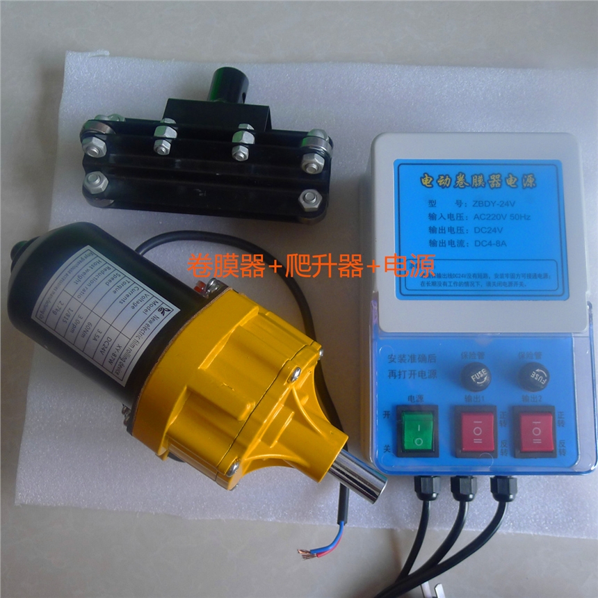 24V配套配件:电动卷膜器,24V电源,爬升器,温控器,手机控制,伸缩杆,卷杆,压膜卡。