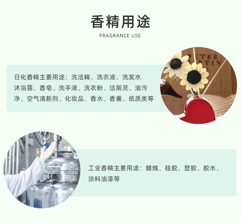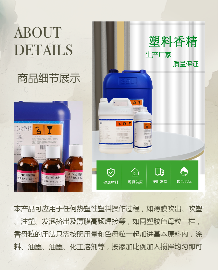 亿特香精是使用环保微胶囊技术生产,具有耐高温、香味浓、长效留香等特点。用于洗衣液、环保型中密度纤维板、环保型高档刨花板,塑料制品、橡胶制品、胶水、水性胶水、再生橡胶、稀释剂、涂料、油漆、油墨、化工溶剂、再生塑料、鞋材、香囊、工艺品、纺织、产品包装内、空调出风口、宾馆房间、家庭用品、文具用品汽车内饰件及保健、美容和化妆品的包装。它极易应用于生产塑料制品的过程中,使制品有很好的留香效果。香精香粉可用于任何品种的低密度聚乙烯、高密度聚乙烯、聚丙烯、乙烯一醋酸酯乙共聚物及多种聚烯烃共聚物,任何热塑性塑料操作过程.如薄膜吹膜、吹塑、注塑、发泡挤出及薄膜高频焊接等。只要将香精香粉与其它胶粒,粉体或液体预先混合,再经一般的生产程序,便能使您的制品增添新的竞争力。