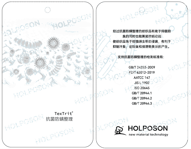 HOLPOSON® Black Widow Mite也叫黑寡妇®,是有机菊酯类高分子抗菌防螨整理剂,适用于几乎所有类型的纤维,如:棉,粘胶,涤纶,尼龙等天然、合成纤维及混纺织物。即可应用在针织物、梭织物、家纺产品、装饰用布等纺织品。本产品可以抑制以下细菌:大肠杆菌、白色念珠菌等,有效防止螨虫的生长、繁殖,赋予纺织品抗菌防螨功能